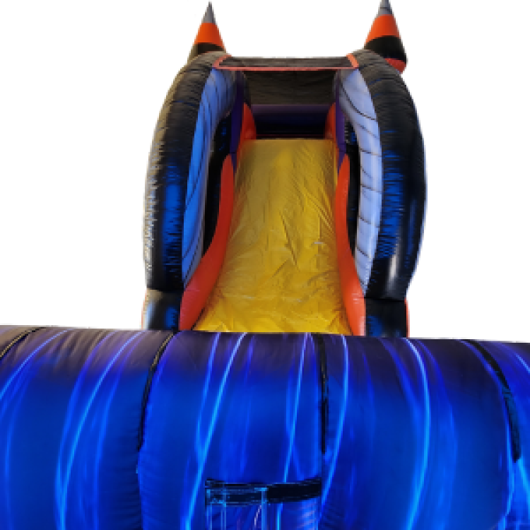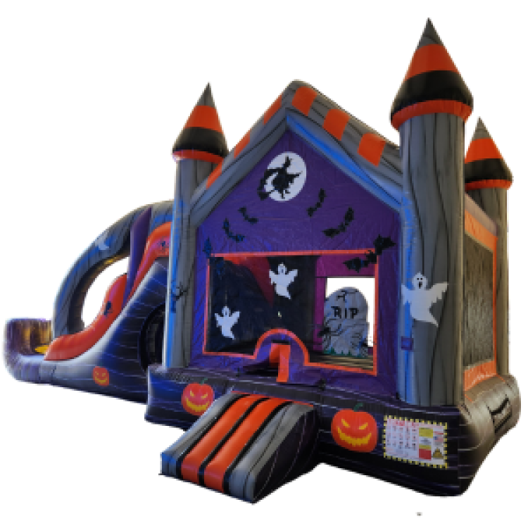 Spook-tacular fun for parties and events — this haunted-themed inflatable combines a roomy bounce area with an attached slide to keep kids entertained for hours. The exterior features classic Halloween motifs and eerie accents that set a festive, slightly spooky tone without being too intense for younger guests. Inside, kids can jump safely on the soft, enclosed bounce surface; the integrated slide adds an extra thrill as they climb and glide down.